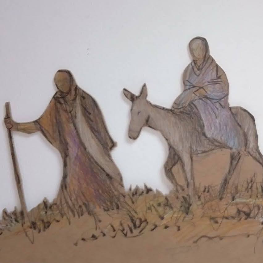 Damien : Je me suis lancé ce matin-là dans ce projet pour la paroisse… Réaliser « grandeur nature » Marie et Joseph pour les faire cheminer devant le chœur tout au long de l’Avent en direction de la Crèche… Le temps de ce projet aura été pour moi aussi un temps de cheminement précieux… Je quittais alors l’ordinateur pour retrouver le plaisir du contact avec le bois, crayons et pastels… Dessiner « en grand », c’est sentir tout mon corps en mouvement, l’énergie se déployer, dans l’élan… C’était bon également de mesurer combien le mental lâche quand on est en contact avec la matière… Au final, j’étais étonné de voir ce qui s’était fait sous ma main sans chercher la maîtrise…